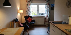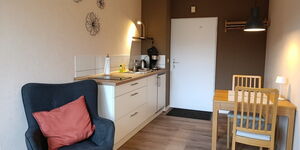 - Küchenzeile: zwei Ceran-Kochplatten, Spüle, Kühlschrank mit Eisfach, Wasserkocher, Filter-Kaffeemaschine, Toaster