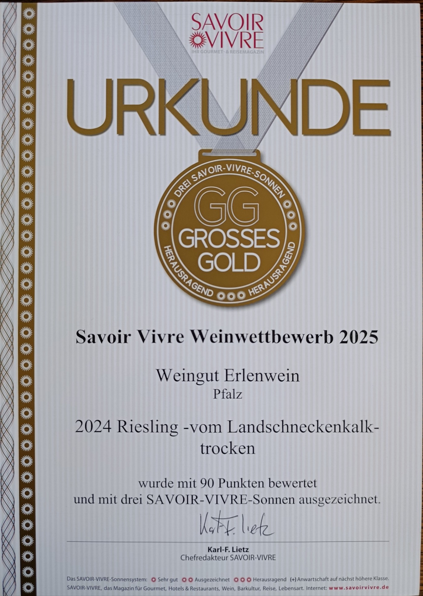 2024 Riesling – vom Landschneckenkalk – trocken – Großes Gold (90 Punkte)