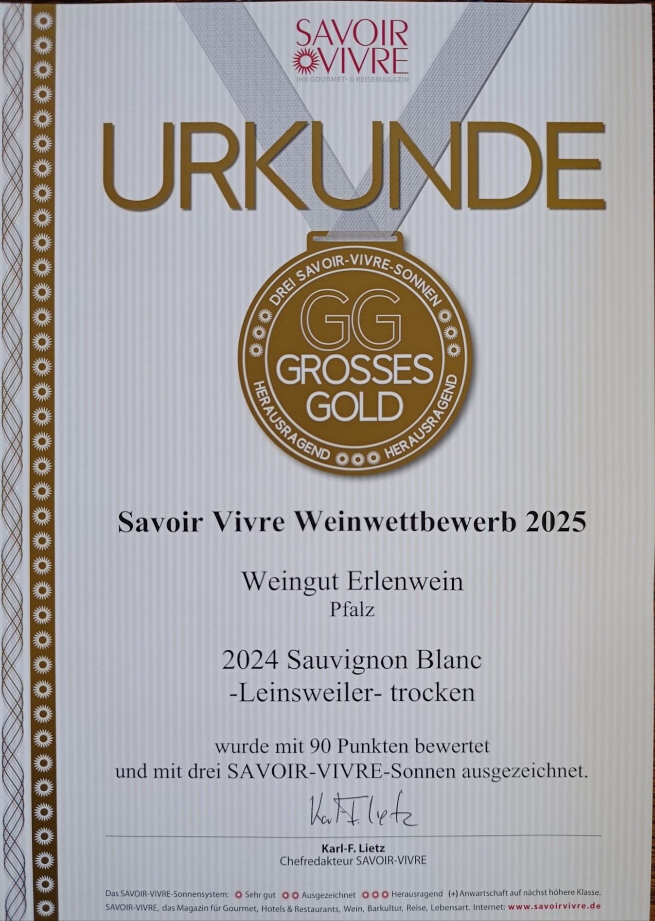 2024 Sauvignon Blanc – Leinsweiler – trocken – Großes Gold (90 Punkte)